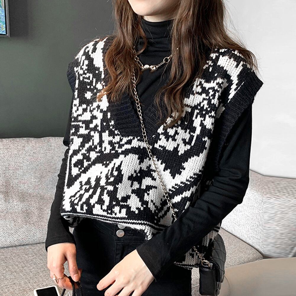 柄 ジレベスト 黒 ノースリーブ トップス 重ね着 プルオーバー チョッキ 人気 無地 配色ニット オフィス 通勤 学院風