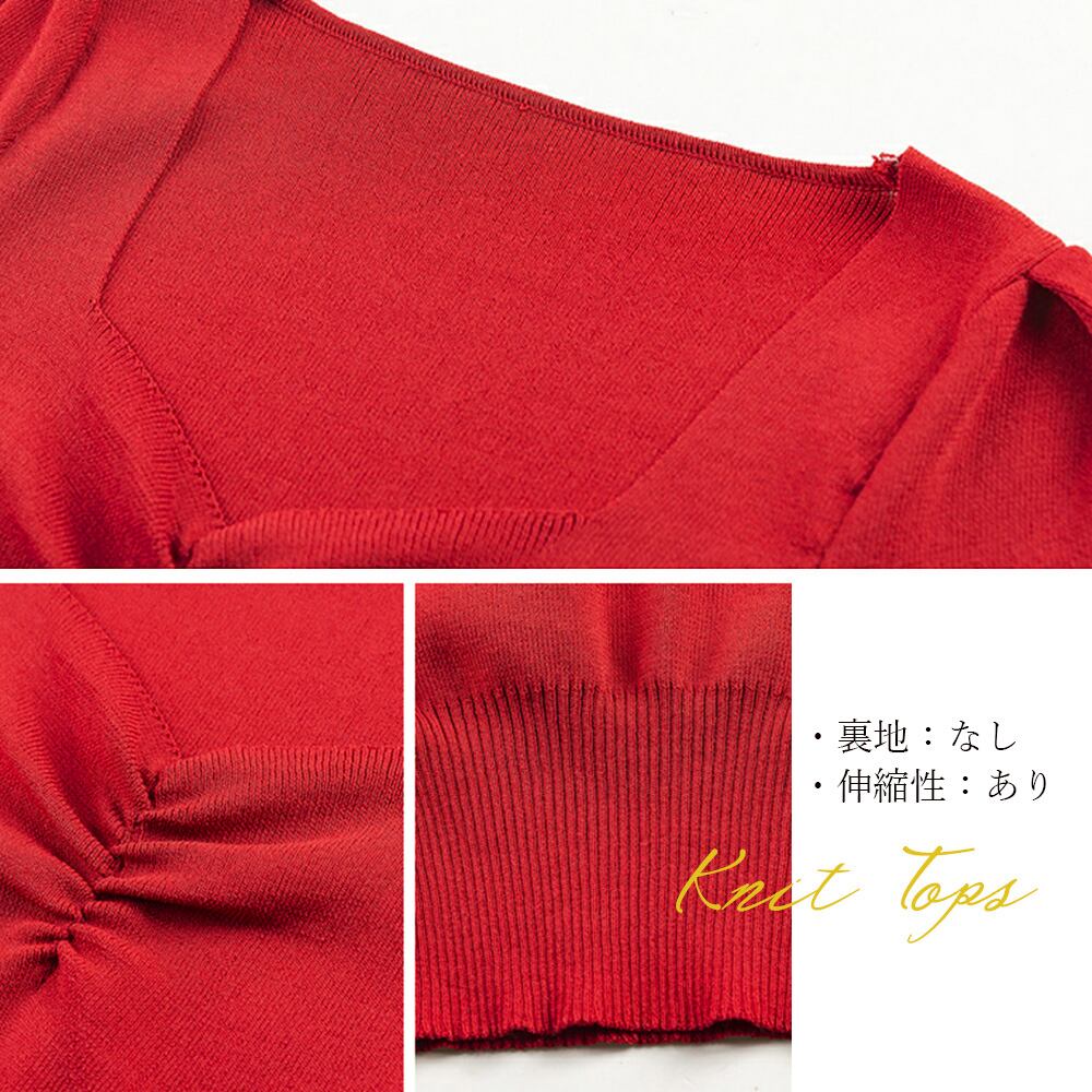 スクエアネック リブニットトップス 半袖 クロップド丈韓国ニットソー 胸元ギャザー セクシーニット おしゃれ20代30代
