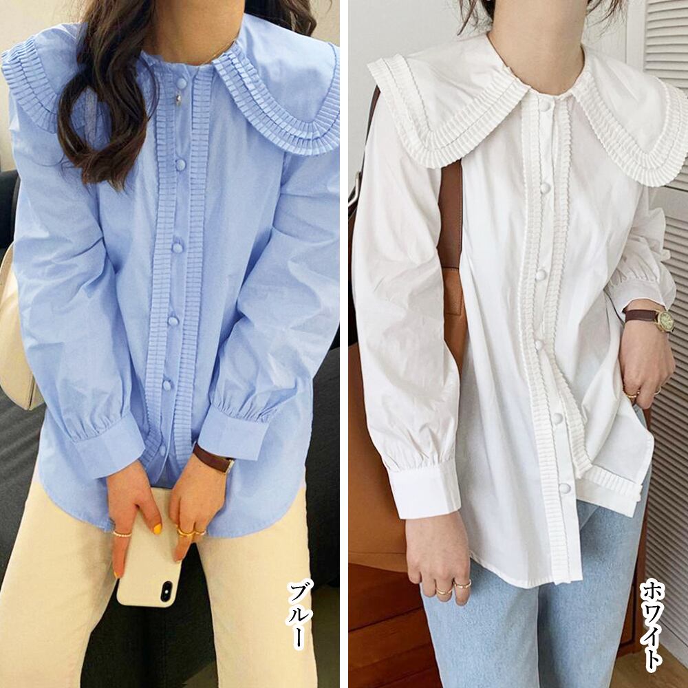 フリルで縁取られた大きめの襟は存在感抜群の長袖シャツブラウス