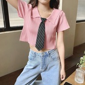 ネクタイ付きガーリー風ショート丈ニットトップス