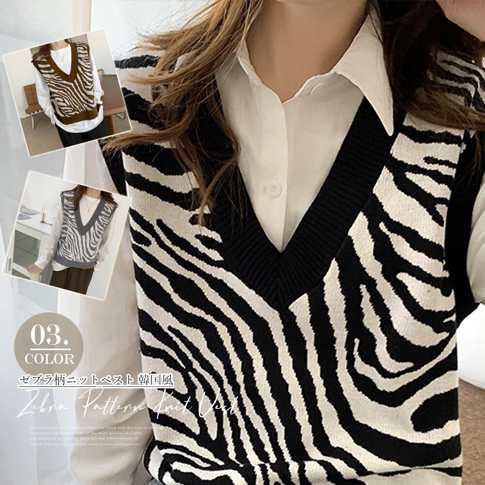 すっきり見えるVネックとゆとりのある身頃デザインのシマウマ柄ニットベスト