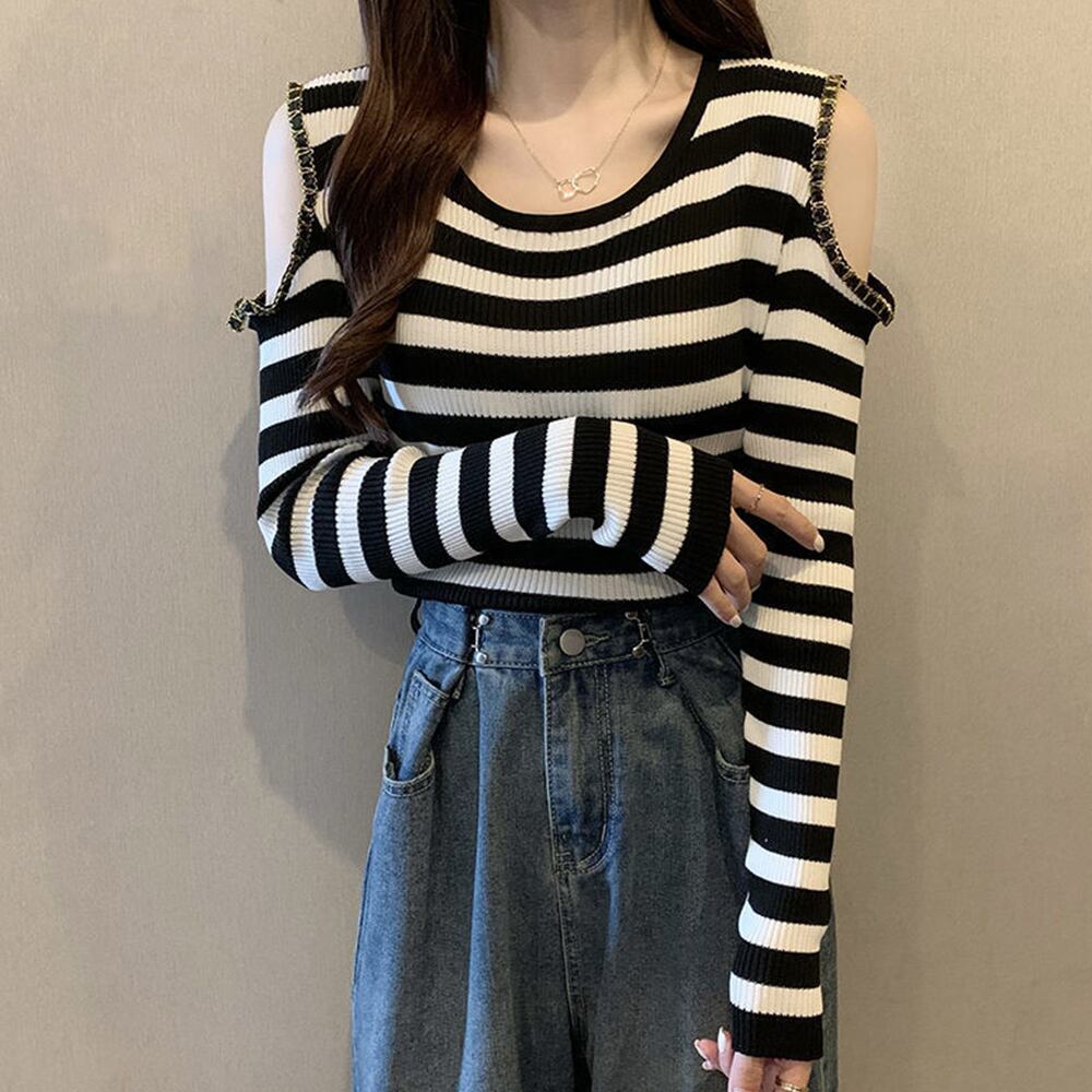 ニットソー 無地 ボーダー柄 ニットセーター セクシー オフショルダーニット クルーネック 肩見せ リブニット