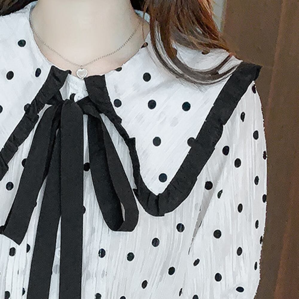 大き目なボウタイが顔回りを華やかに演出してくれドット柄ブラウス