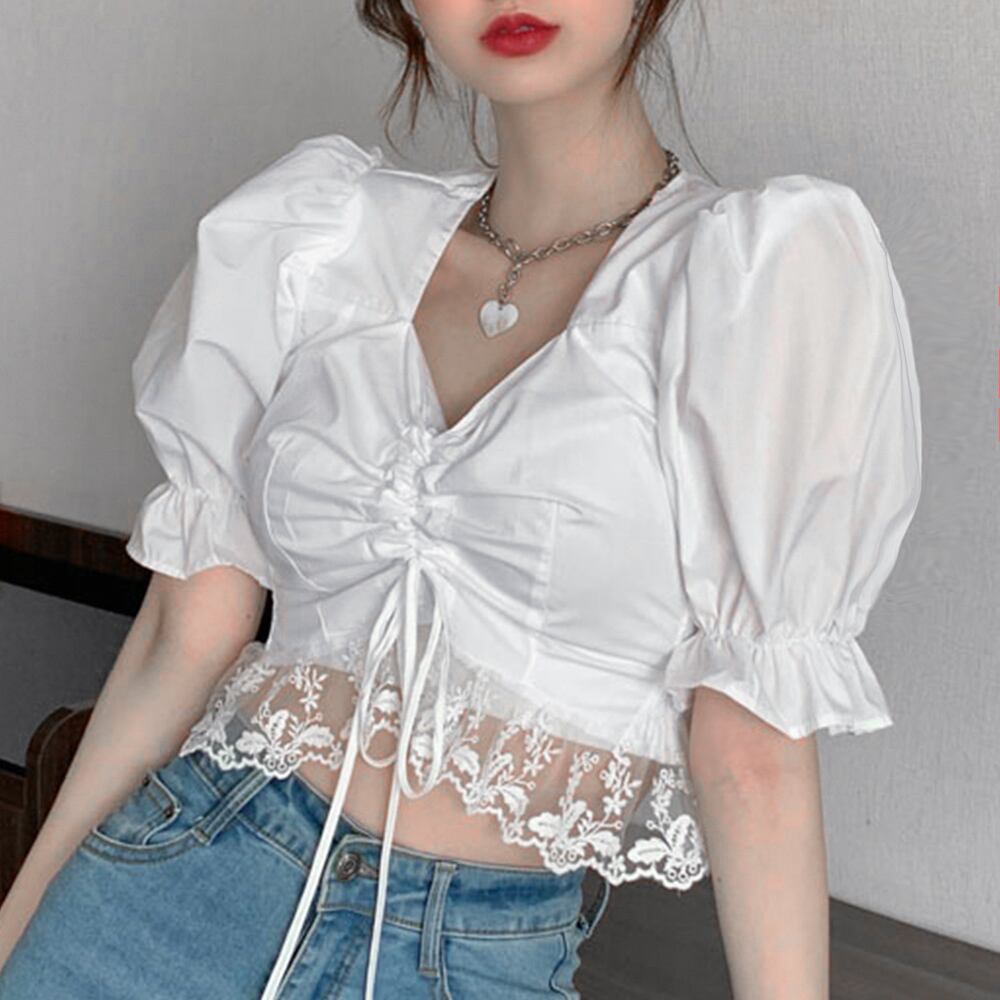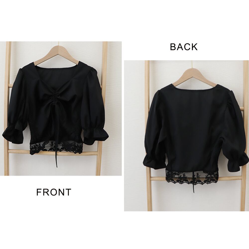 レースアップブラウス ボリューム袖 半袖シャツ レース裾 袖口ゴム トップス 清楚 オルチャン レース切替えトップス 黒