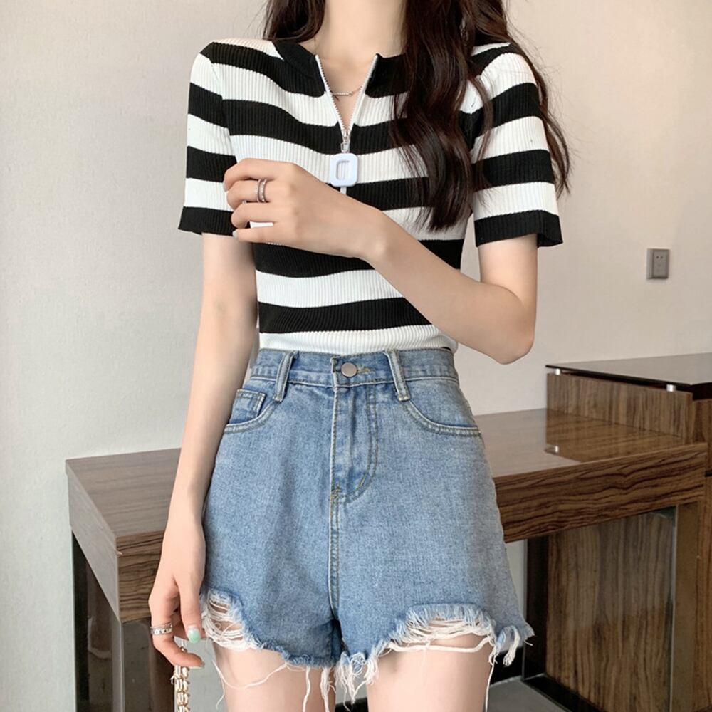 ファスナー付き 韓国風 リブニット 着やせ 半袖 ニットTシャツ シンプル カジュアルニットソー 春秋夏 トップス