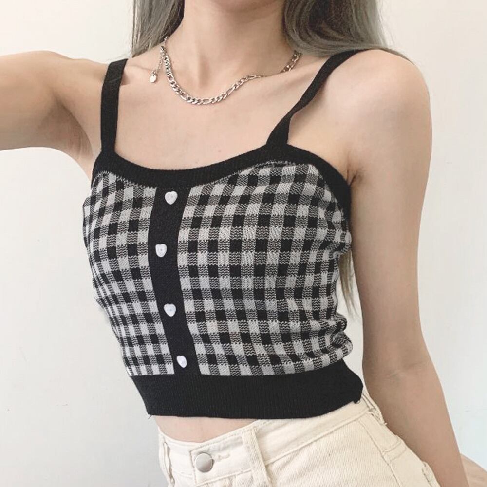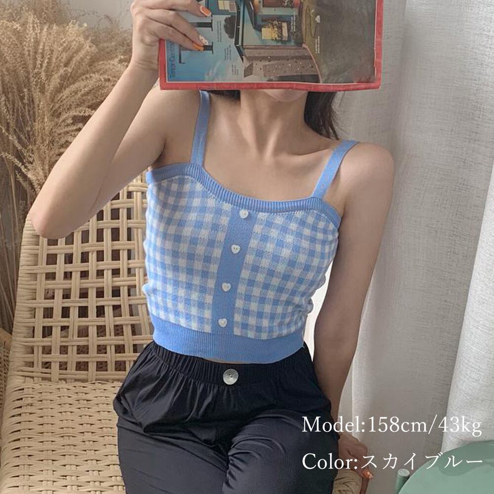 タンクトップ へそ出し サマーニット ハートボタン レトロ 重ね着 インナー 可愛い コーデ 夏