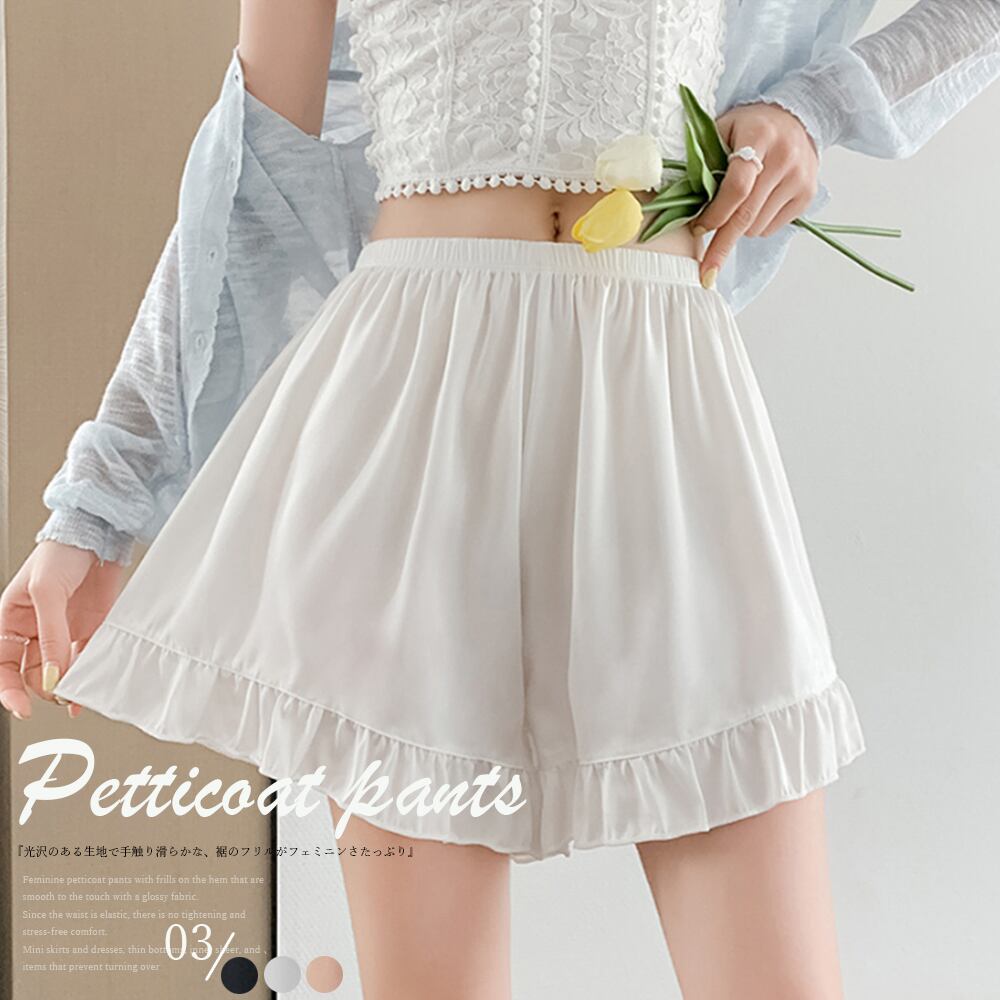 光沢のある生地で手触り滑らかな、裾のフリルがフェミニンさたっぷりなペチコートパンツ