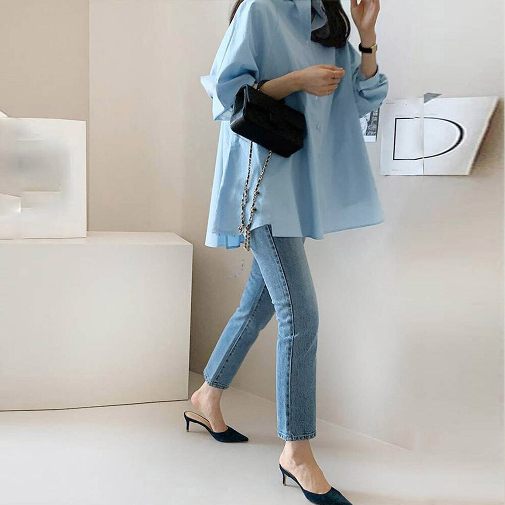 ボタンをいつもより少し多めに開けて着ることで、鎖骨をきれいに見せて女性らしい印象に
