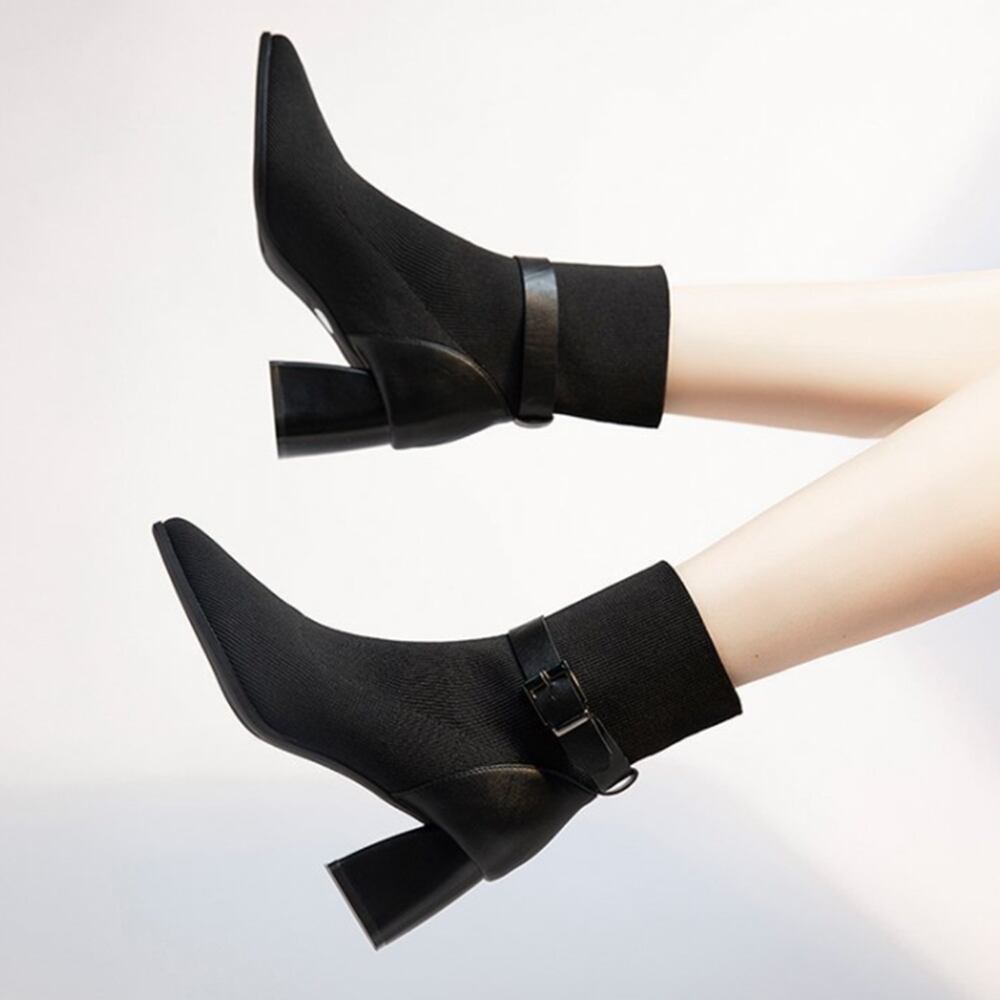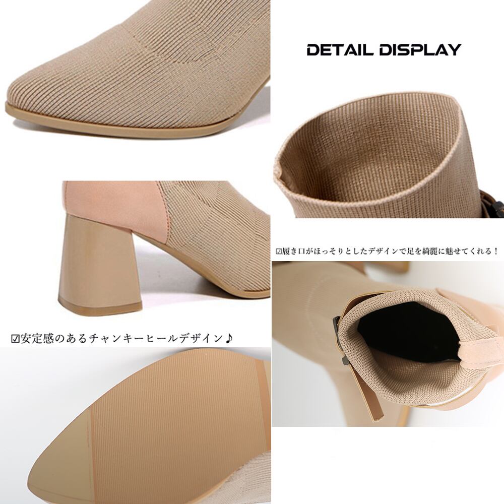 おしゃれ ソックス風 ストレッチブーツ ポインテッドトゥ ハーフブーツ 履きやすい チャンキーヒール ブーティ 痛くない