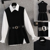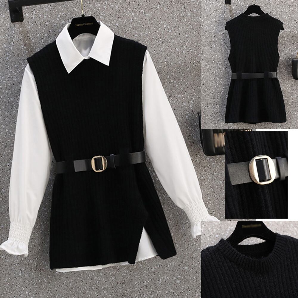 ニットベスト レディース ベルト付き シャーリング袖ブラウス セーター スリット入り 無地 女子会 長袖