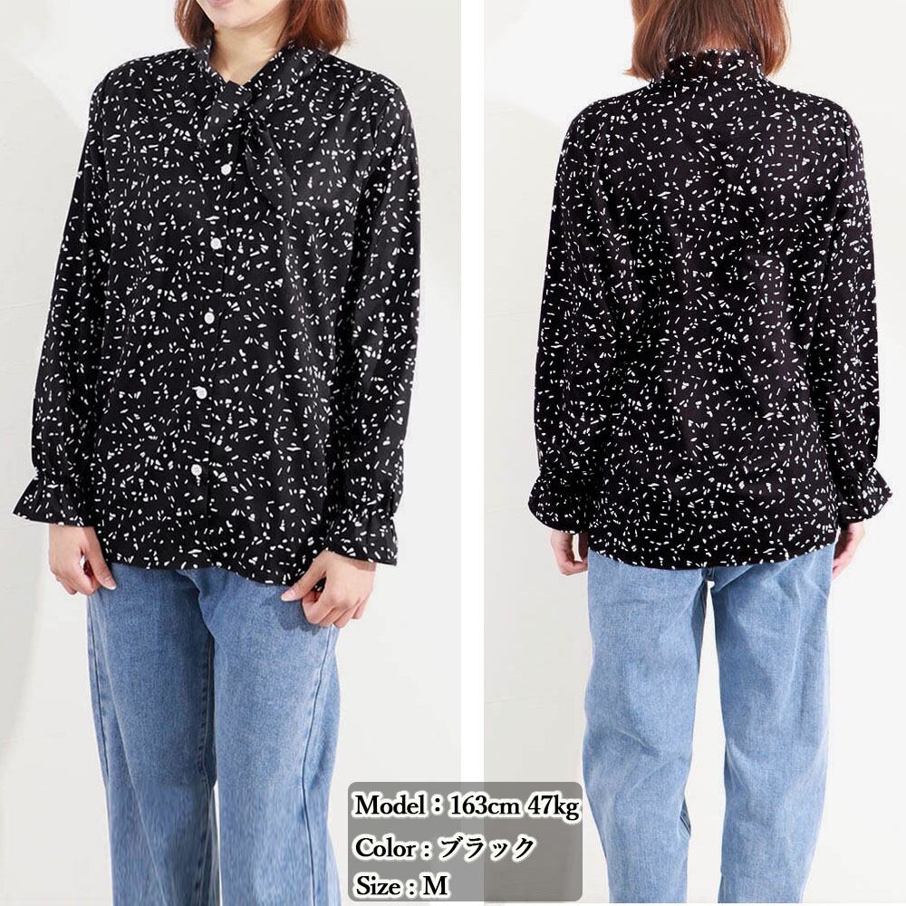 上品 オフィスブラウス 大人 長袖 シャツ 春秋 新作 プリント ゆったり 袖パフスリーブ フリル リボンタイブラウス