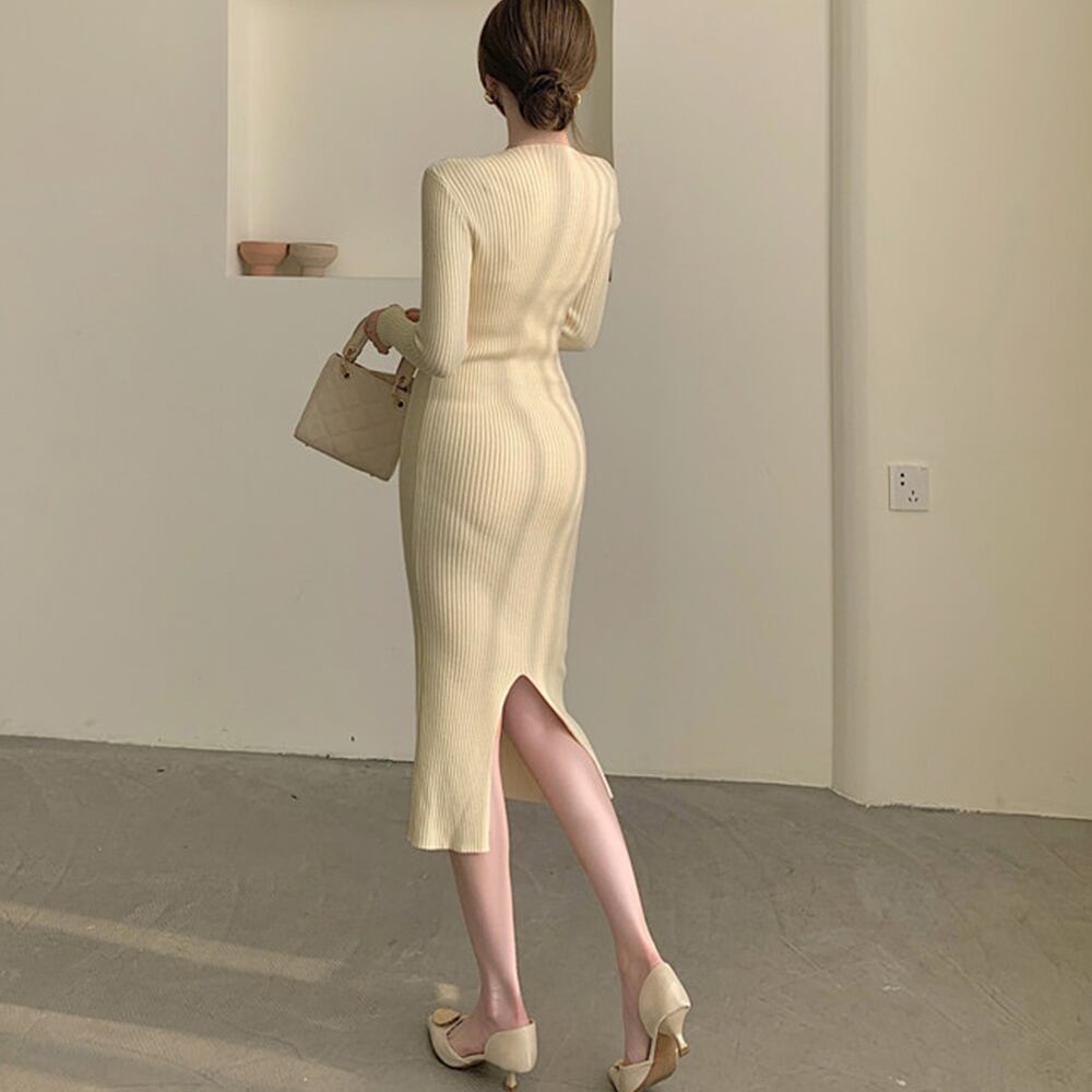 タイト ニットワンピース クロスネック