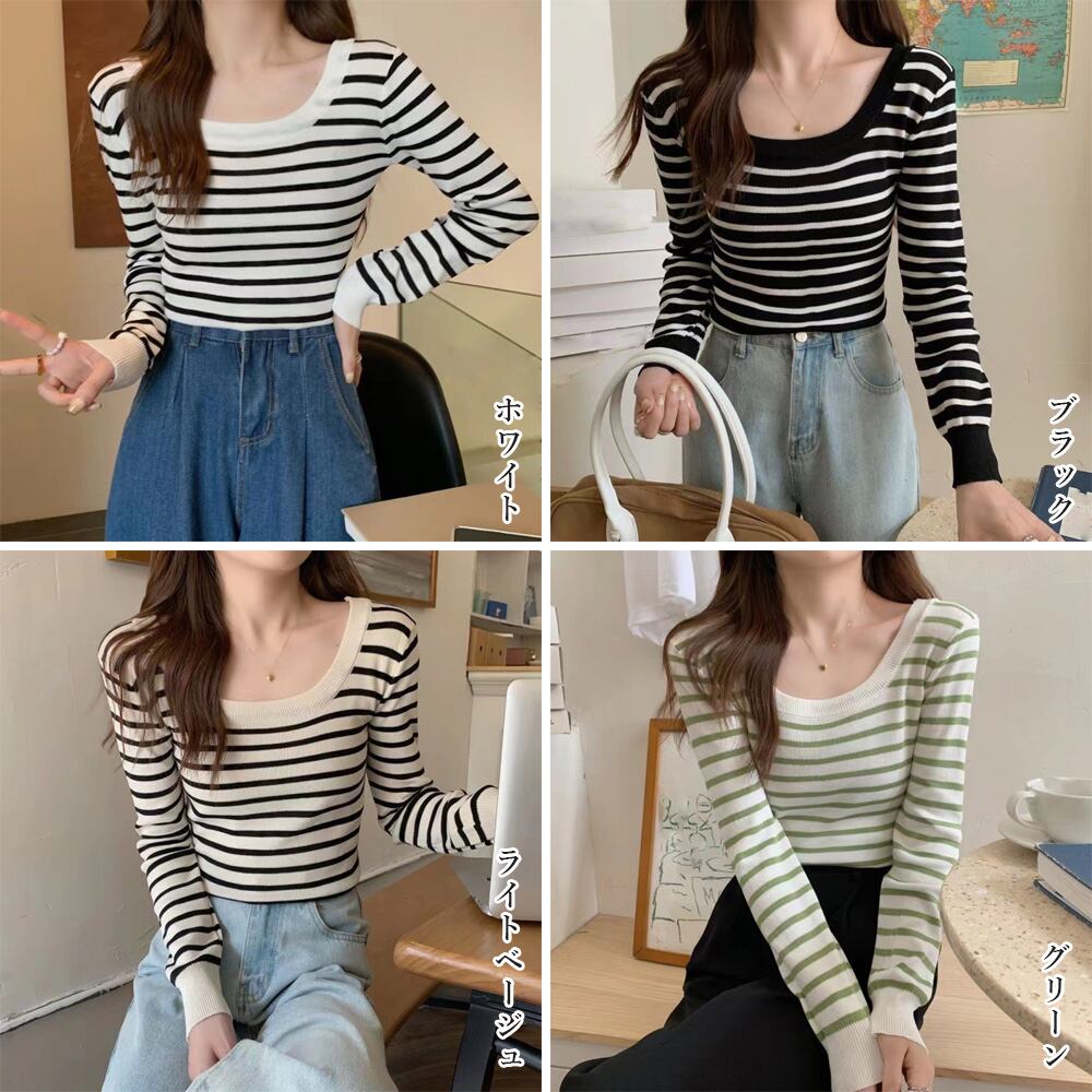 ボーダー柄ニットトップス スクエアネック