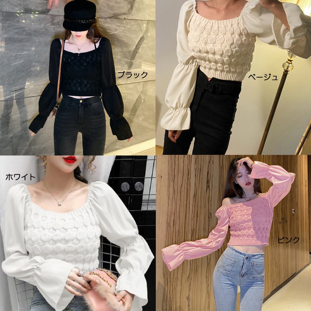 シャツブラウス スクエアネック レディース 長袖 ショート丈ニットトップス