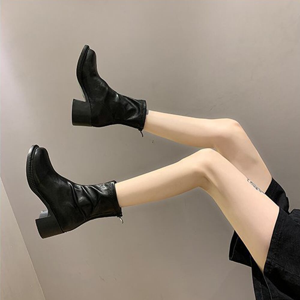 レディース フェイクレザー ショートブーツ ラウンドトゥ 太ヒール ミドルブーツ 秋冬 履きやすい シューズ 韓国風