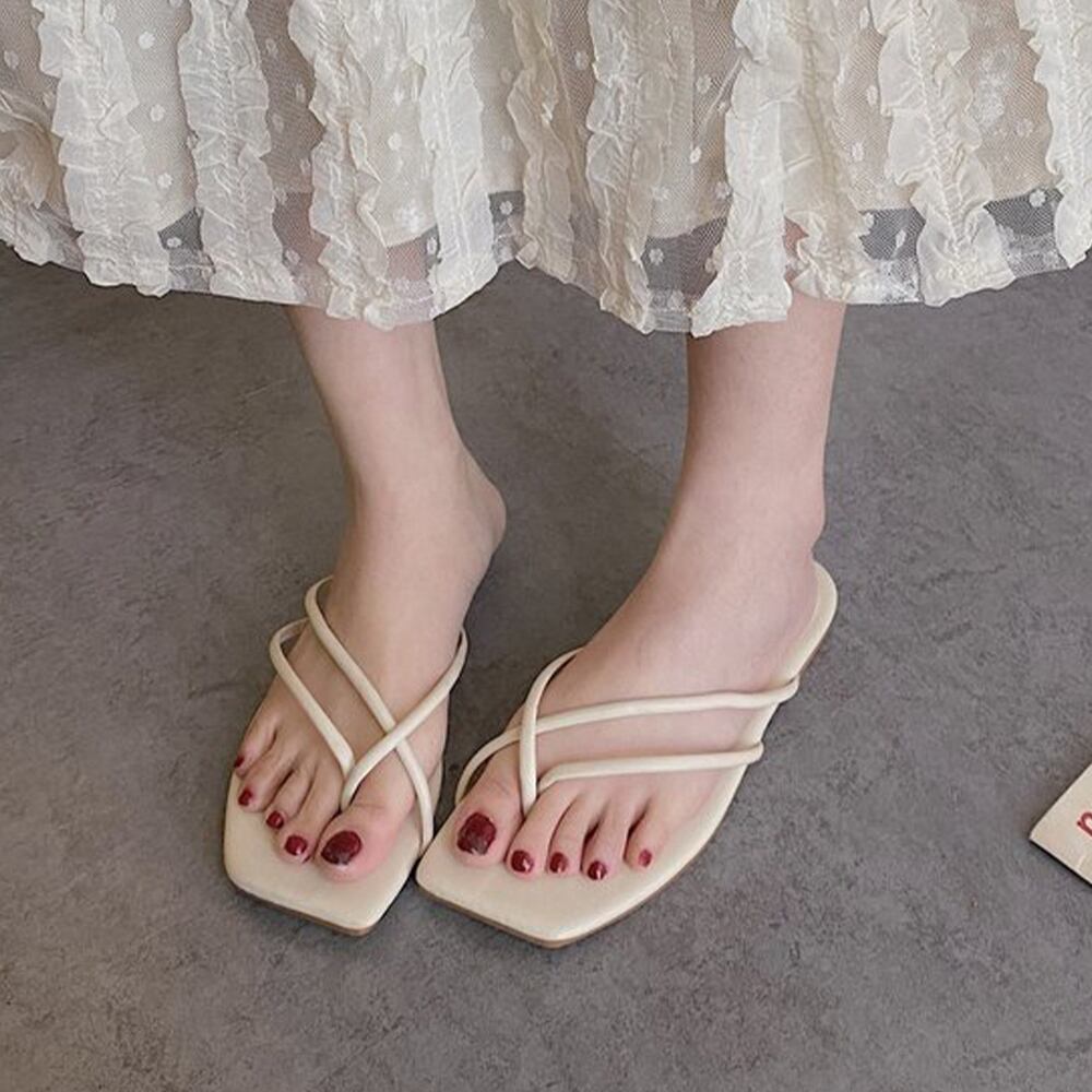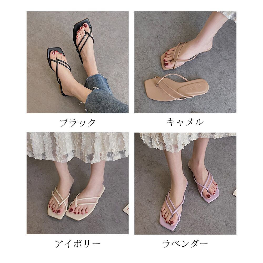 使いやすいブラック、アイボリー、キャメル、ラベンダーの4色展開のフラットサンダル。