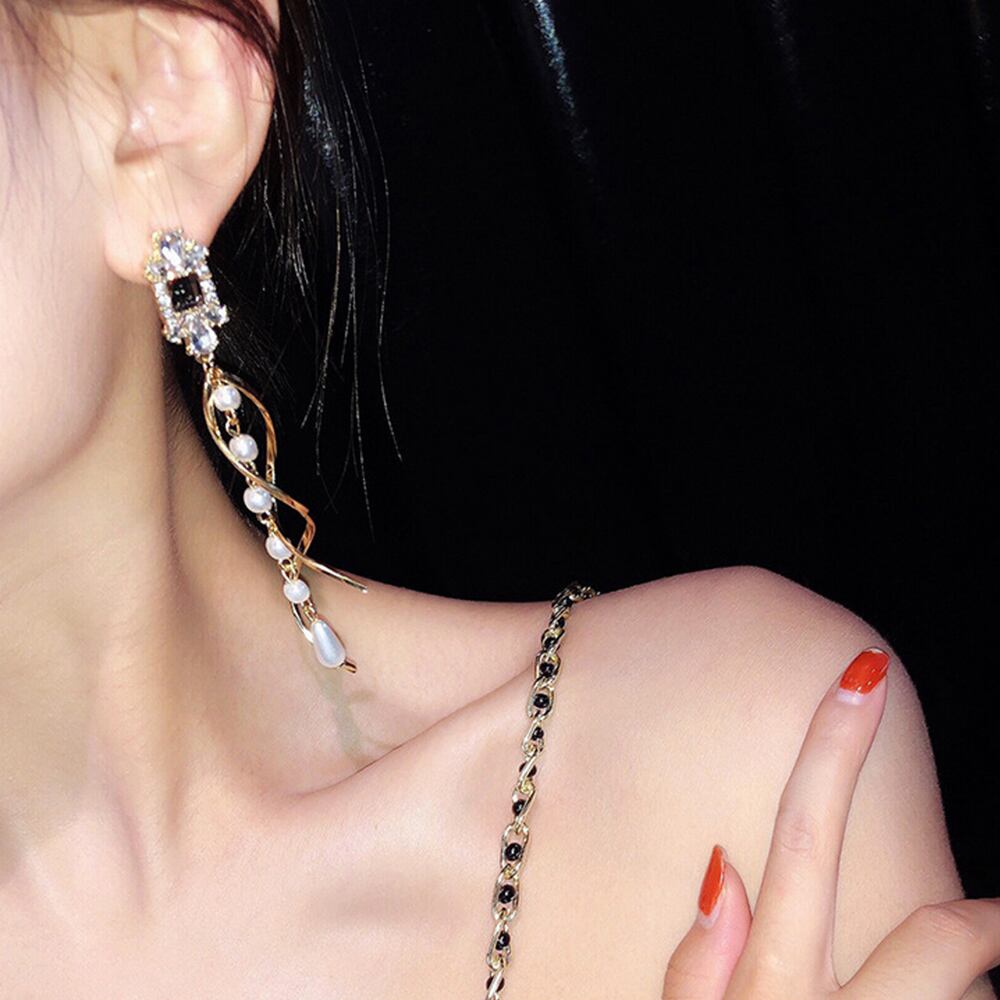 大きめビジューを贅沢に使用、スパイラルらせんチェーンと大粒パールのロングピアス