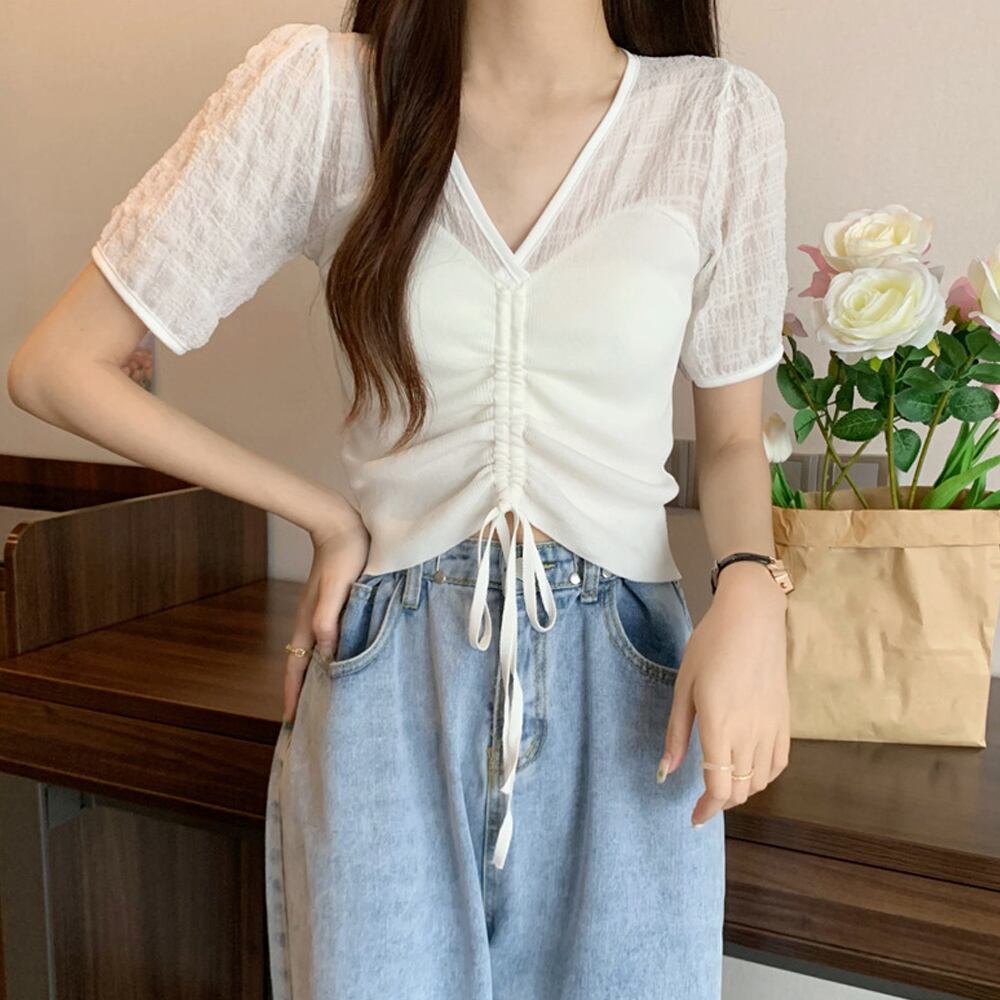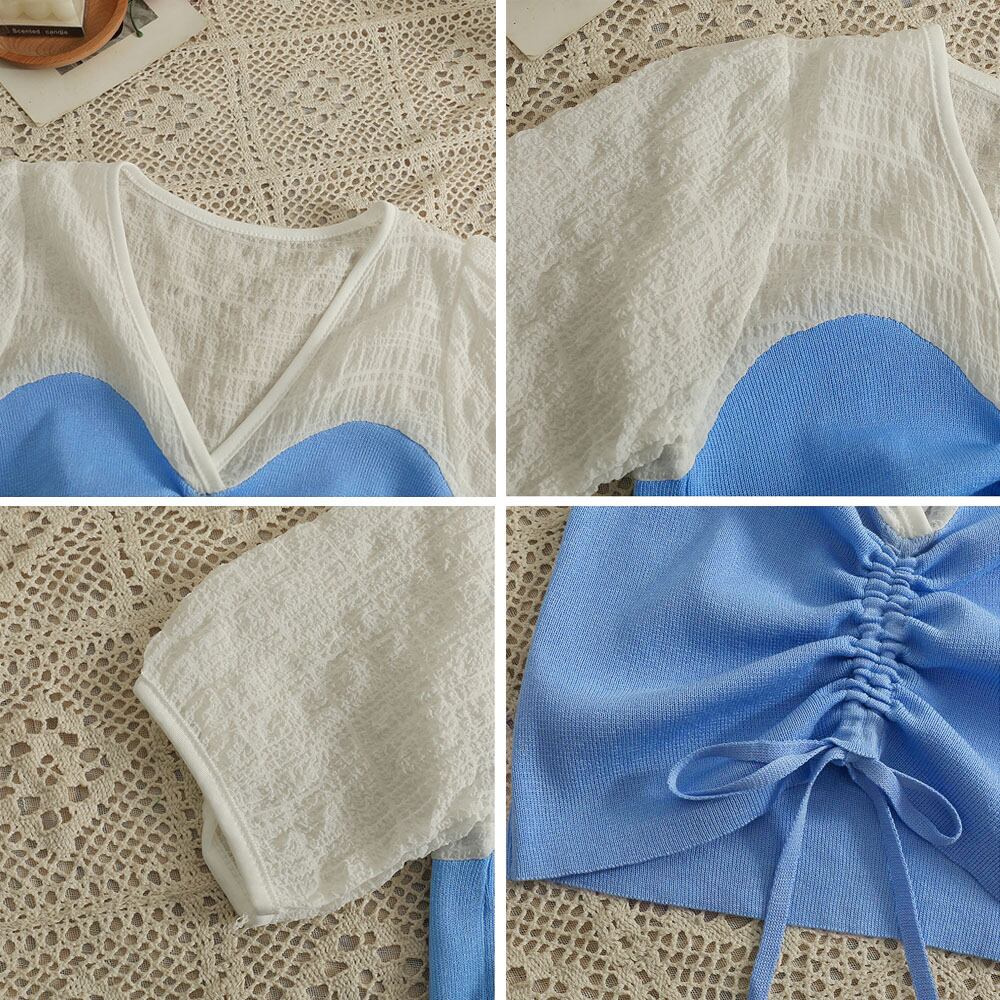 ドッキングニット レディース 異素材切り替え ブラウス 薄手 ニットシャツ細身 ショート丈ブラウス お洒落