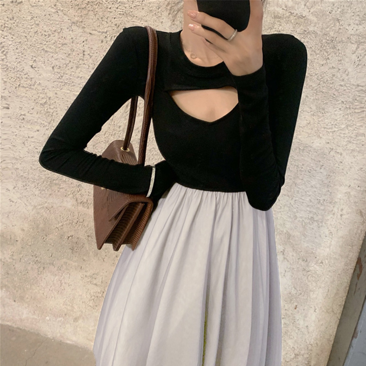 おしゃれ 異素材MIX チュールワンピース 長袖 ミニワンピ 着やせ 可愛い 春秋ワンピ カジュアル 胸元セクシー 韓国