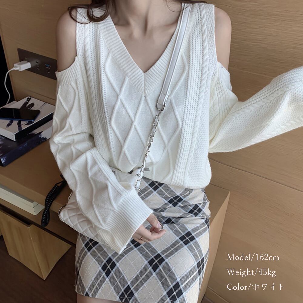 ケーブル編みニット レディース 肩だしニット ニットセーター Vネック