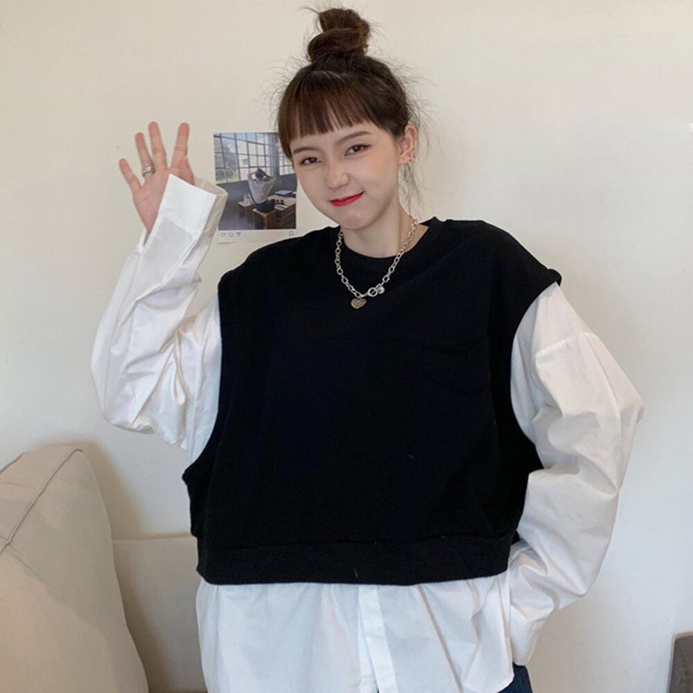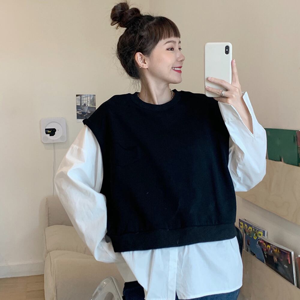 レディース ゆったり 異素材 クールネック シャツドッキング プルオーバー トップス おしゃれ 無地