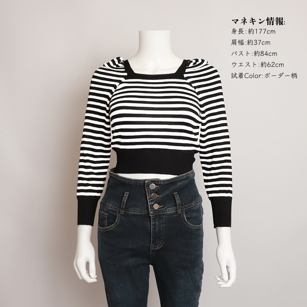 スクエアネック ショート丈 ニットセーター 韓国ファッション ウエア 無地 ボーダー柄 きれいめ カジュアル 春秋冬