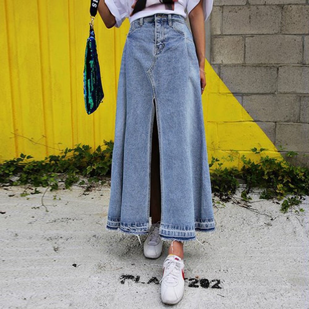 韓国風 スカート こなれ感 スリット入り フレアスカート 大きいサイズ レトロ スカート裾フリンジ ロングスカート 無地