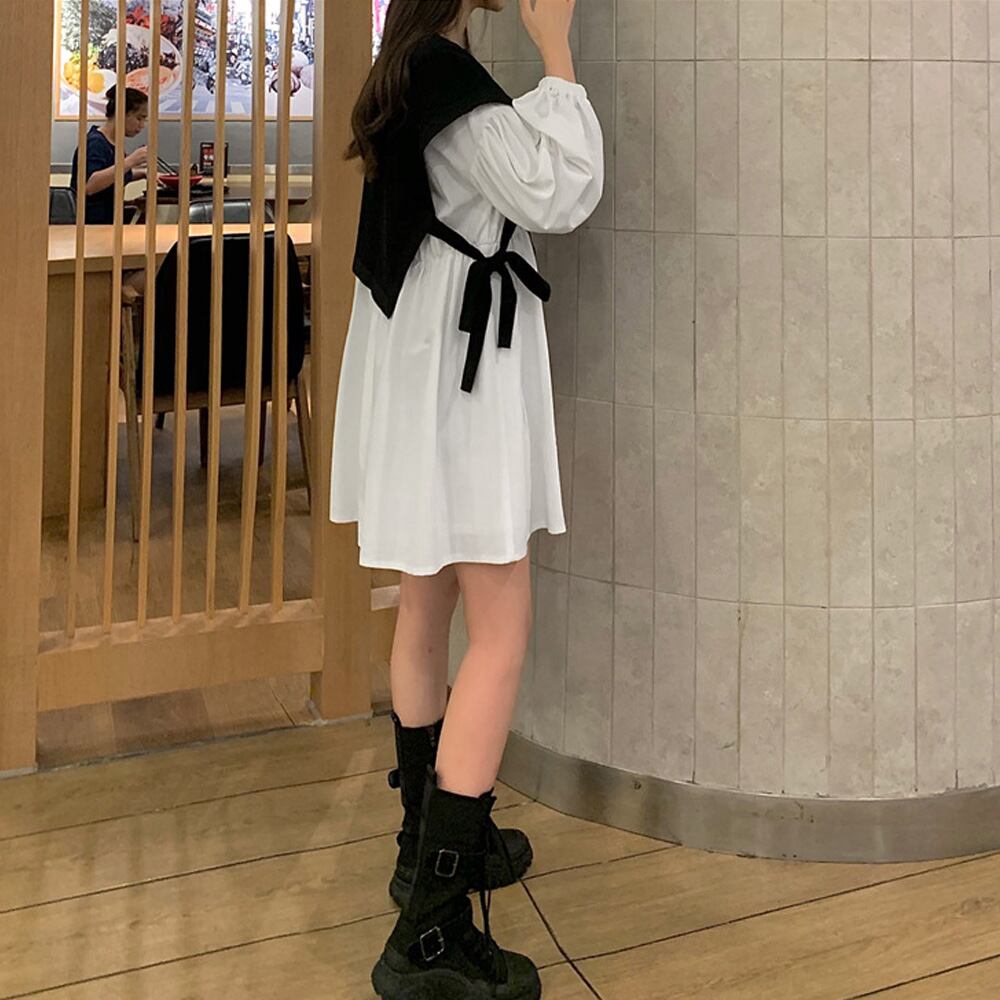 シャツワンピース レディース ベストレイヤード風 おしゃれ 長袖ワンピース 白