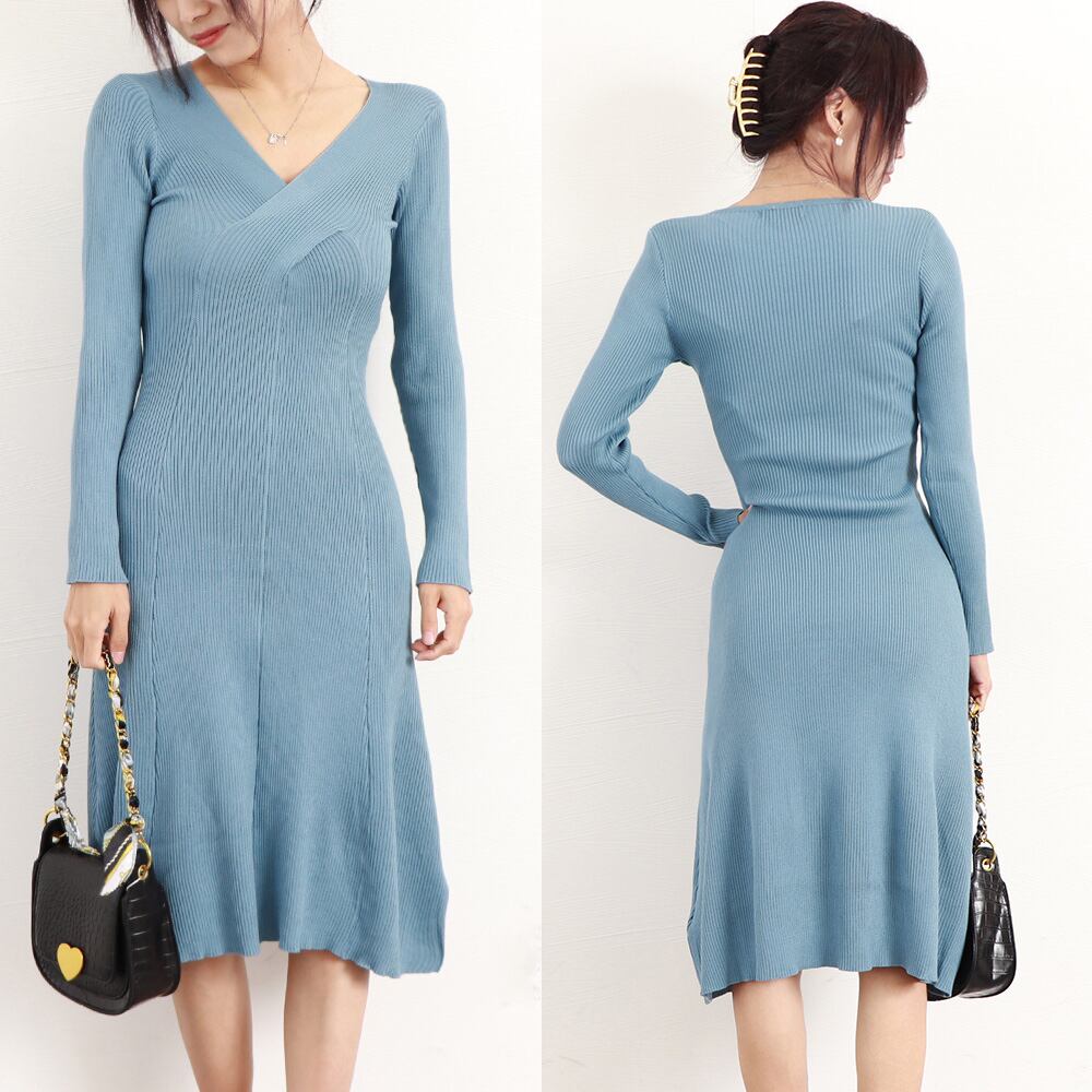 ミモレ丈ワンピース 長袖秋冬 ハイウエスト リブニットドレス フレアワンピ Vネック 韓国風 きれいめ 秋冬服 オフィス
