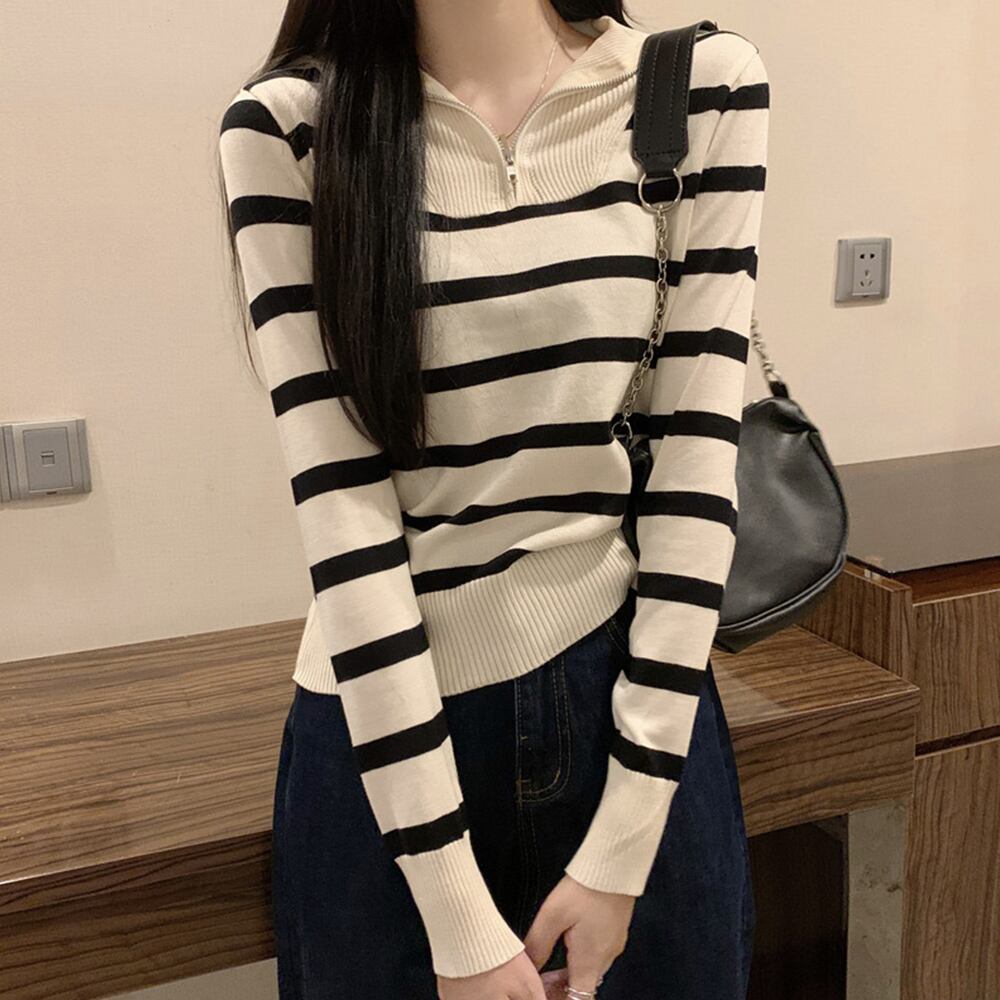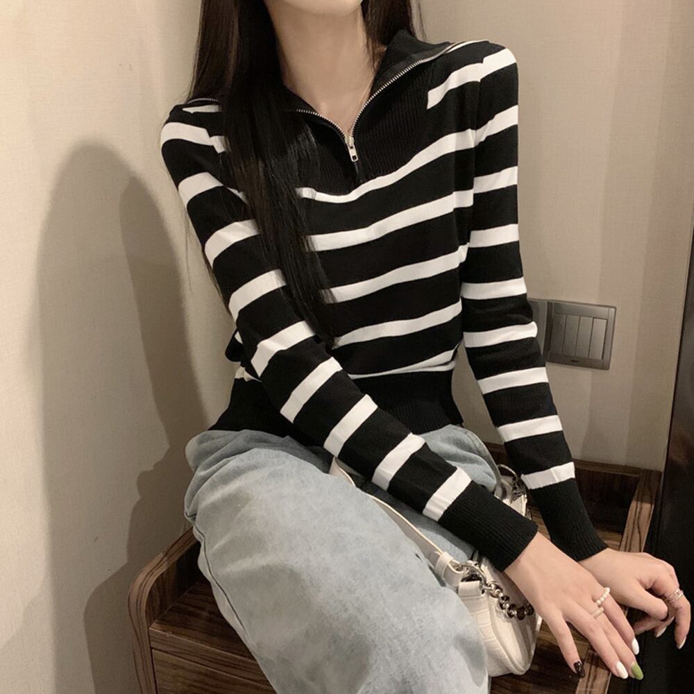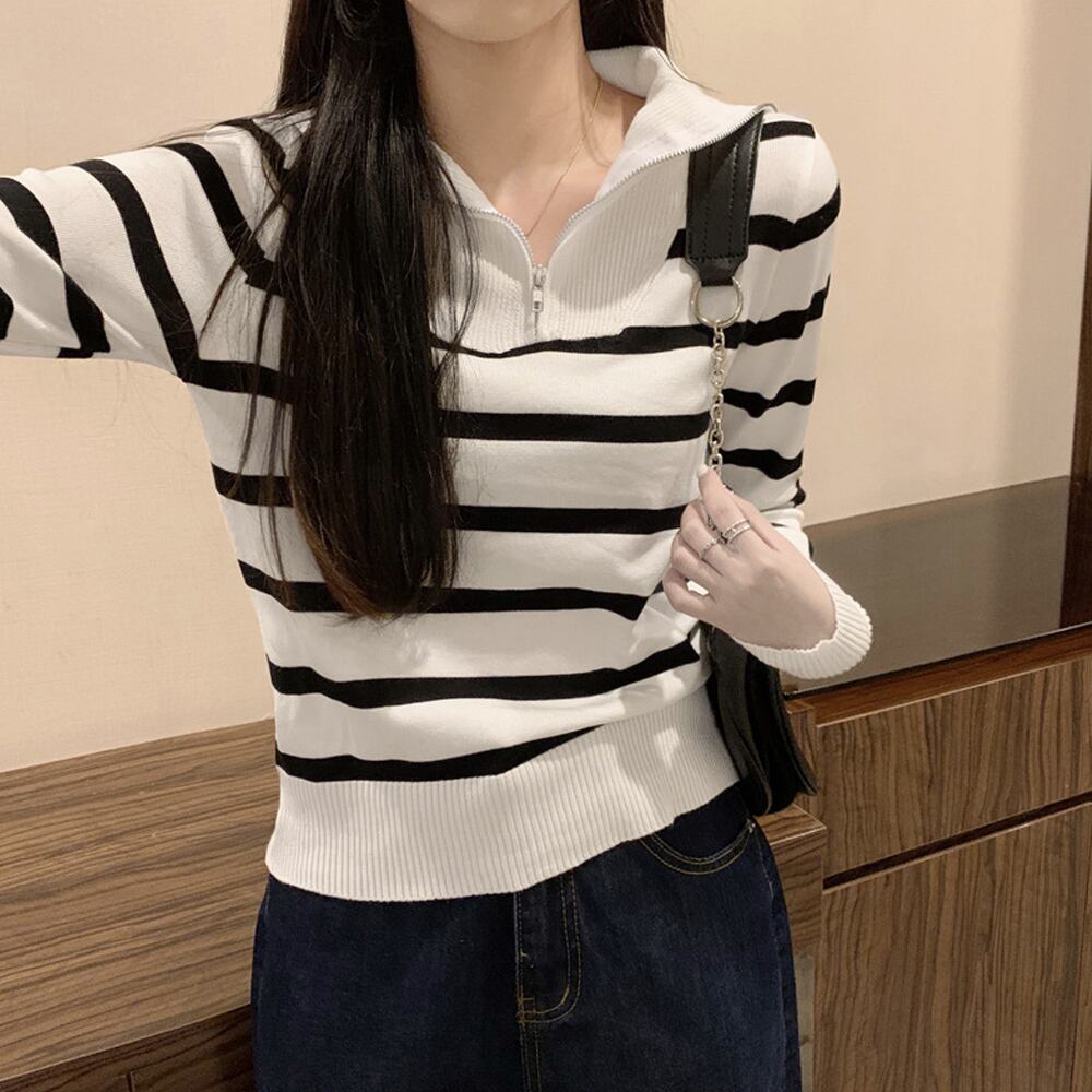 大人カジュアルにトレンドのハーフジップデザインのボーダーニットトップス