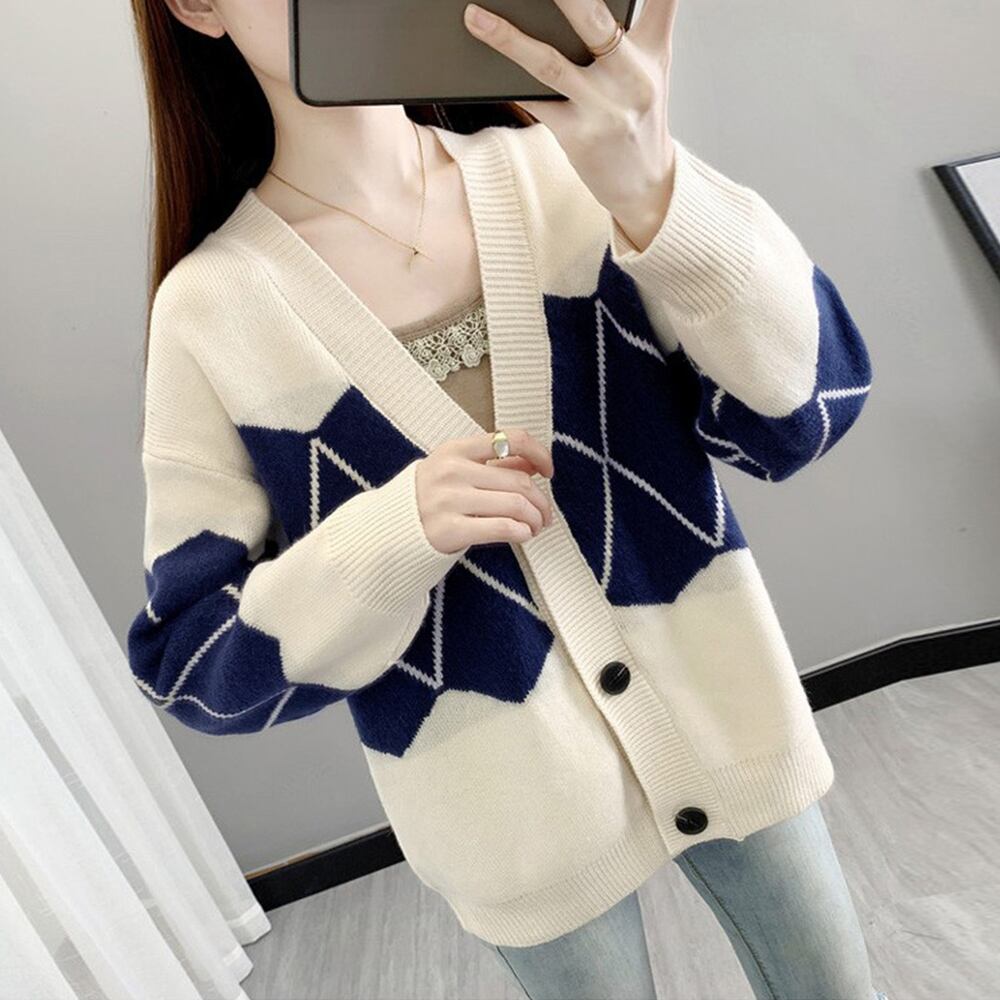 レディース アーガイル柄カーディガン 羽織り ニットアウター 韓国風 Vネック 秋服カジュアル 前開き トップス通勤通学