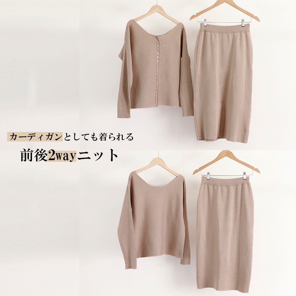 前後2way ニットトップス スリットスカート 上下セット オフィスカジュアル アンサンブルニット 大人女性 韓国 長袖