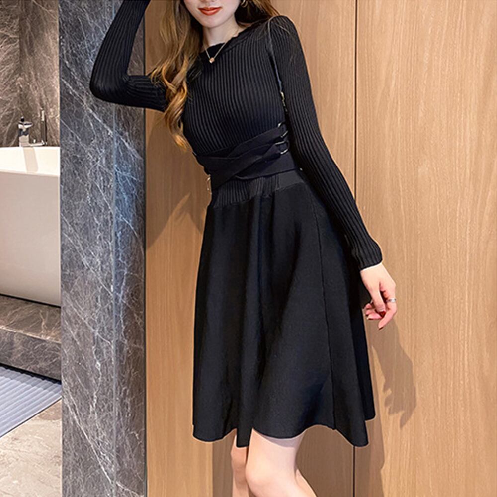 きれいめワンピース 体型カバーニット黒 クルーネックワンピ
