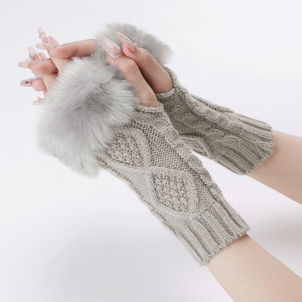 暖かな雰囲気を醸し出すケーブル編みのファー付きアームウォーマー