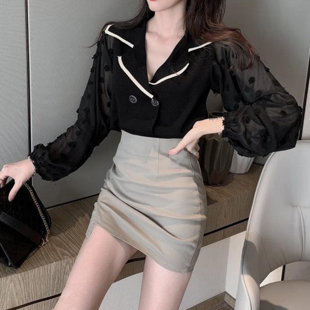 Vネック ニットブラウス ダブルブレスト 袖切り替え おしゃれニットトップス オフィスカジュアル 大人可愛い 韓国春秋夏