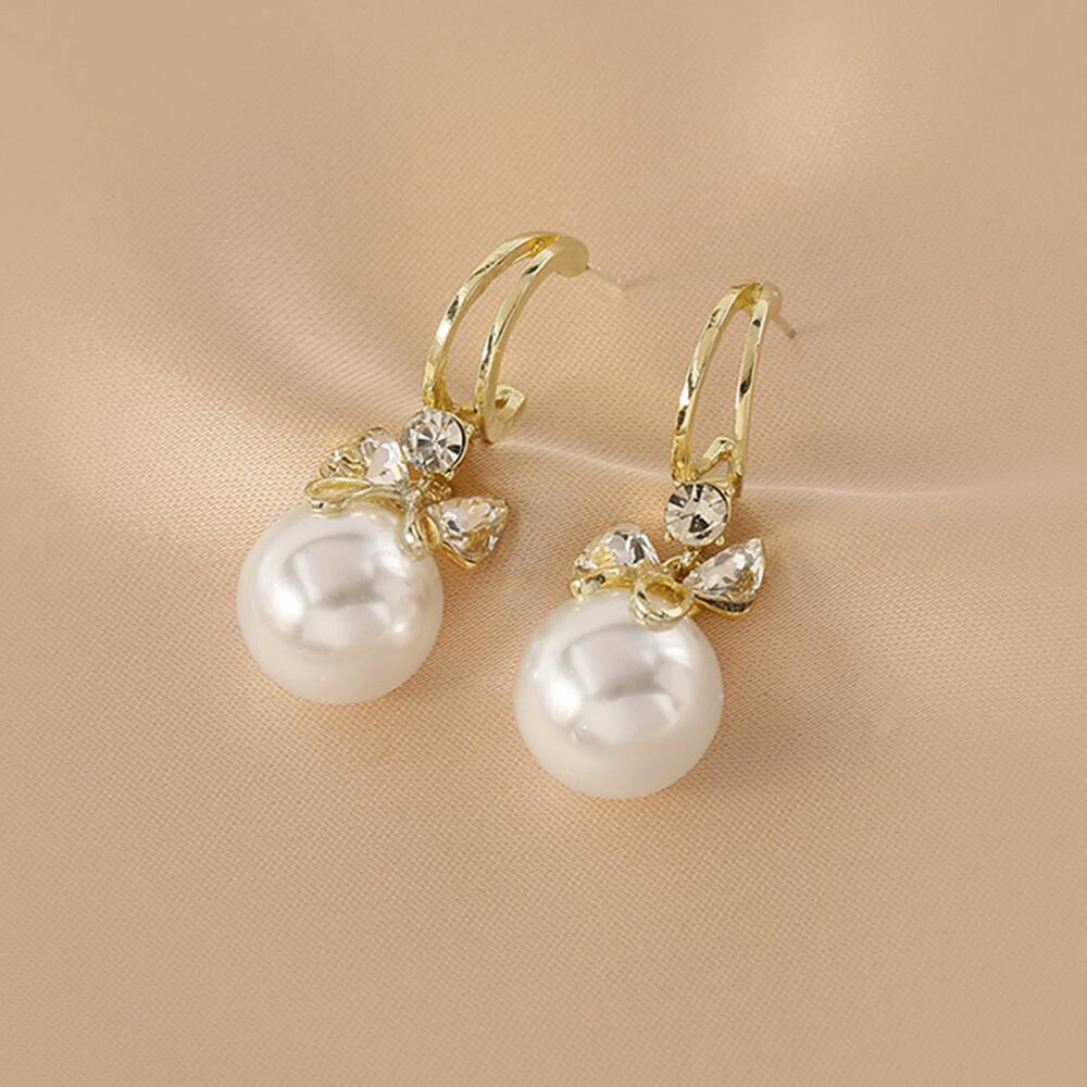 きらきら輝くラインストーンで飾られたリボンモチーフと大ぶりの一粒フェイクパールのデザインピアス