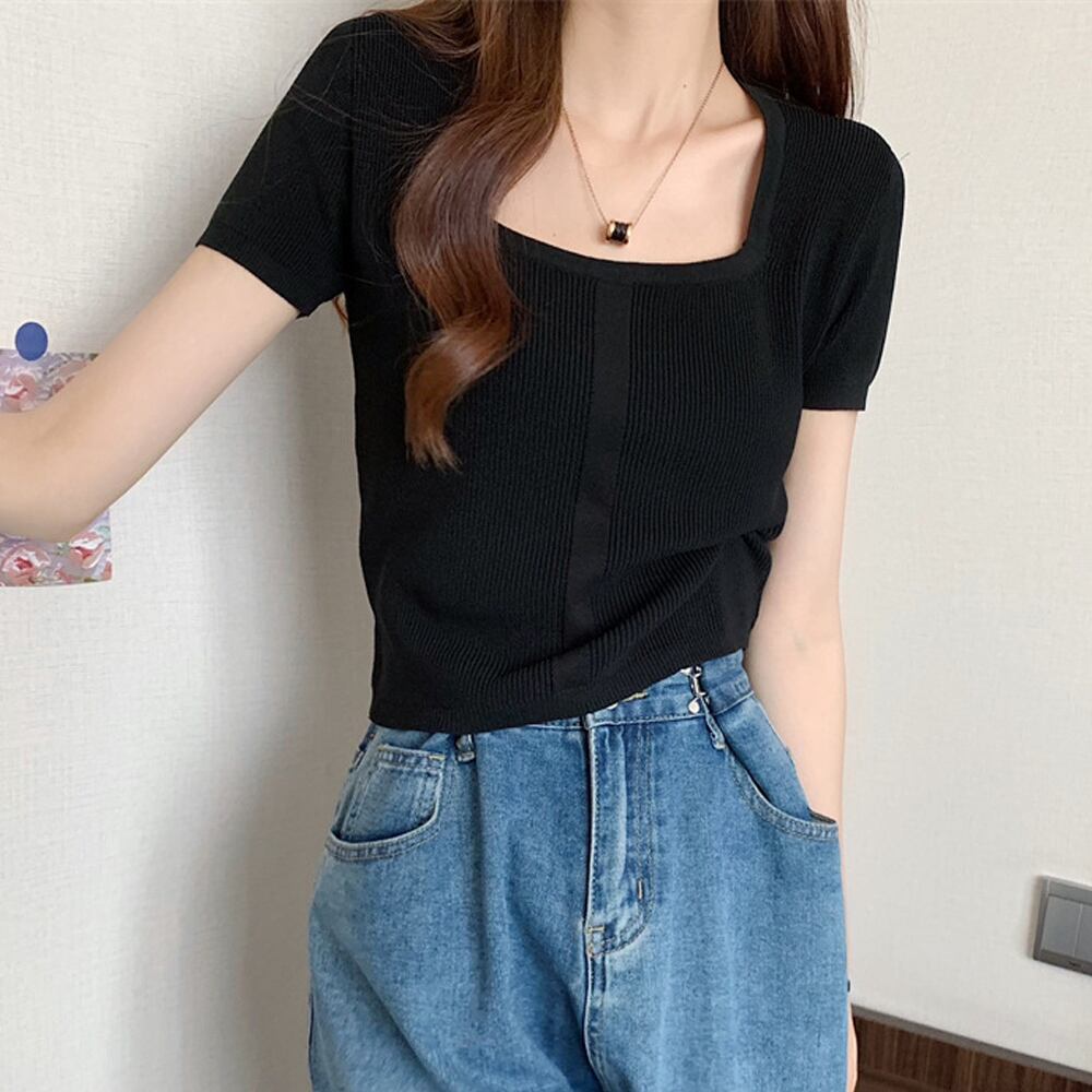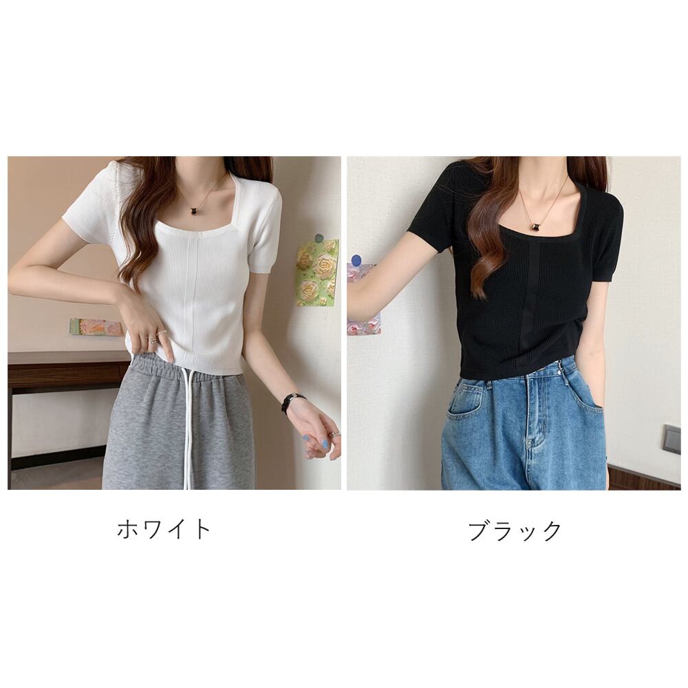 レディーストップス スクエアネック ニットカットソー 半袖 着やせ プルオーバー 薄手シンプル 上品カジュアル 通勤通学