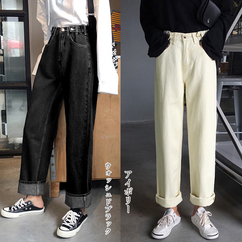 ハイウエスト セミワイドデニム ジーンズ ジーパン 流行 春秋冬 ロングパンツ 美脚 ウエスト調整ボタン付き おしゃれ