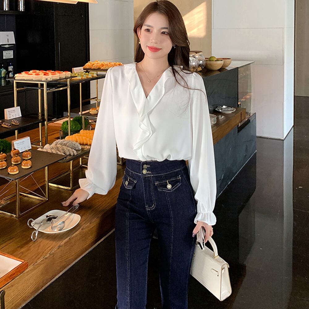 フェミニン春秋夏服 シフォンブラウス白 フリルシャツ 薄手