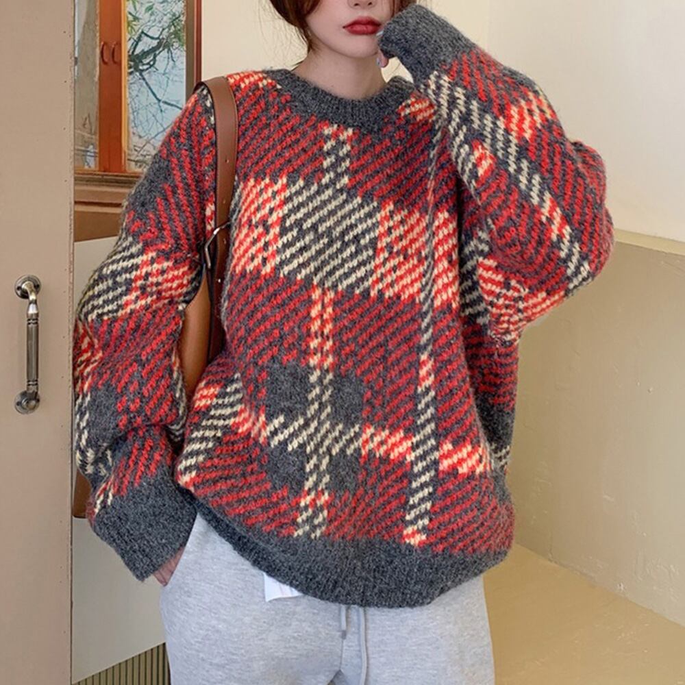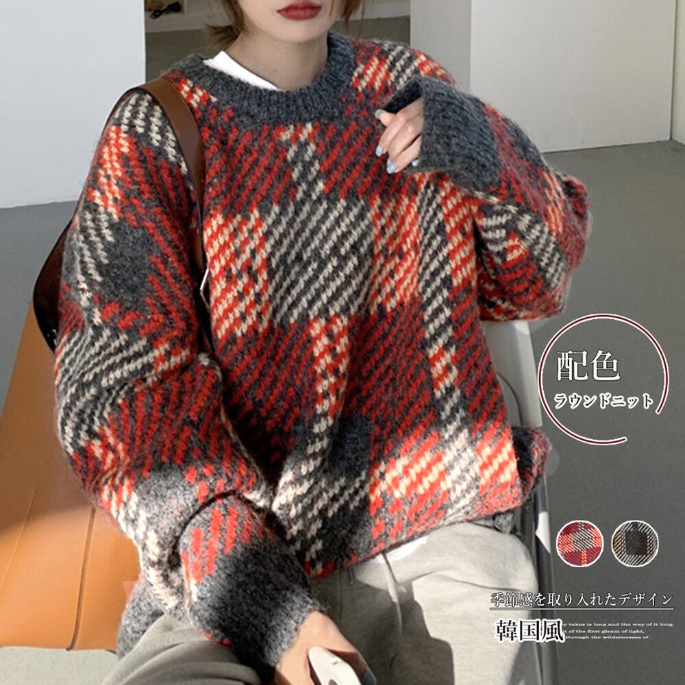 ニットセーター デカチェック柄 配色秋冬