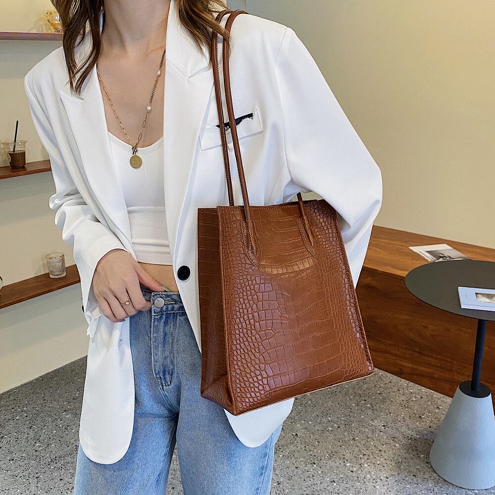 トレンドのスクエアフォルムのクロコ型押しトートバッグ
