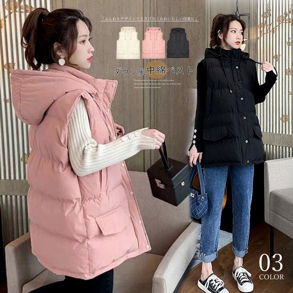 フード付き 無地 ノースリーブジャケット 軽量 ショートベスト フーデットブルゾン 袖なし アウター 冬服 暖かい