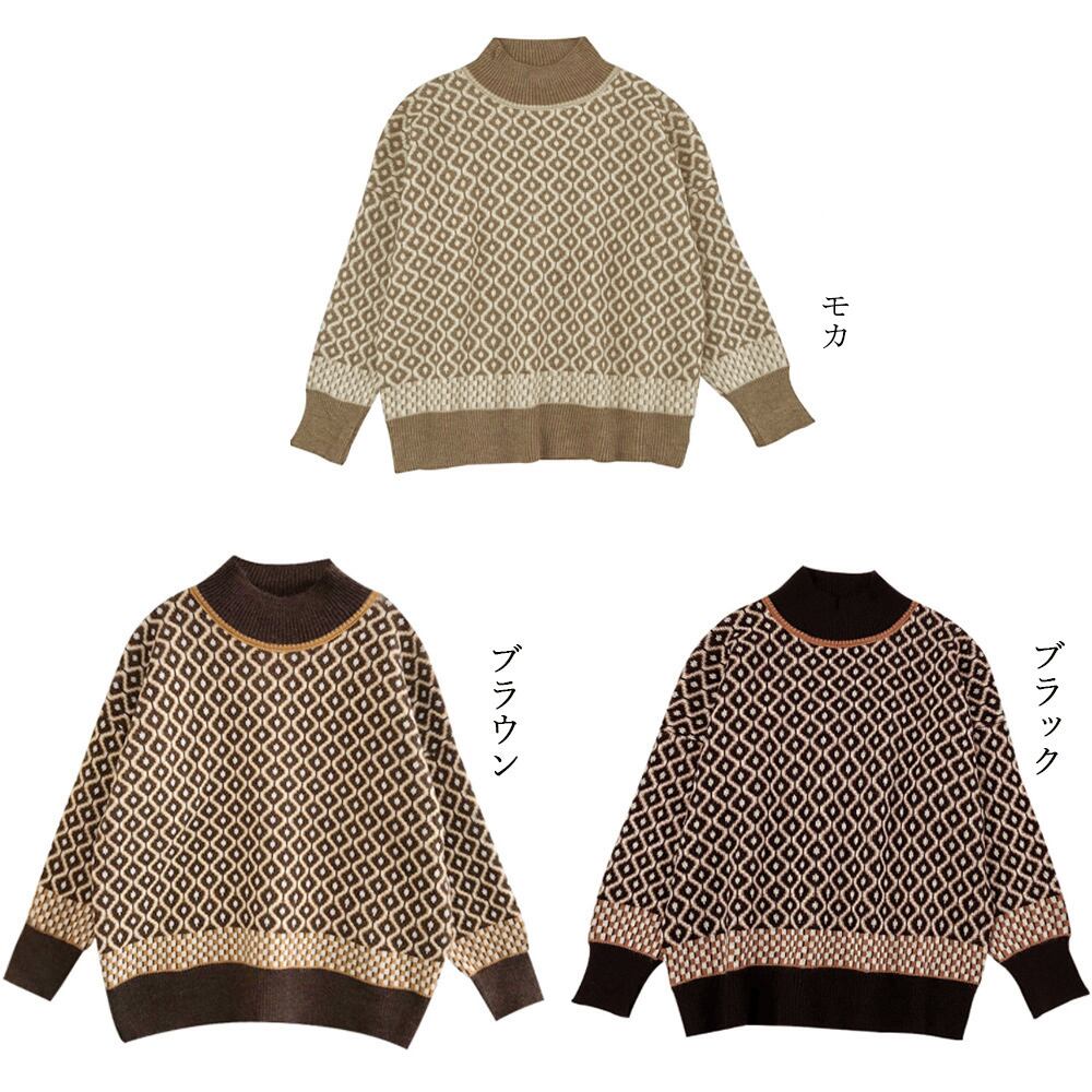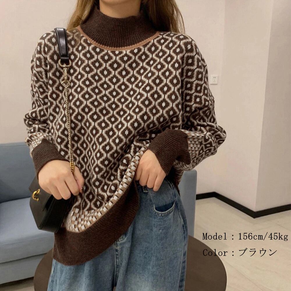 韓国風 ジャガードニット レディース 幾何学柄 長袖 タートル セーター レトロ 中肉厚 ニットプルオーバー カジュアル