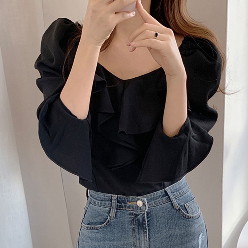 レディース ラッフルカラー とろみブラウス パフスリーブ トップス フレア袖 おしゃれ ブラウス きれいめ 春先行 人気