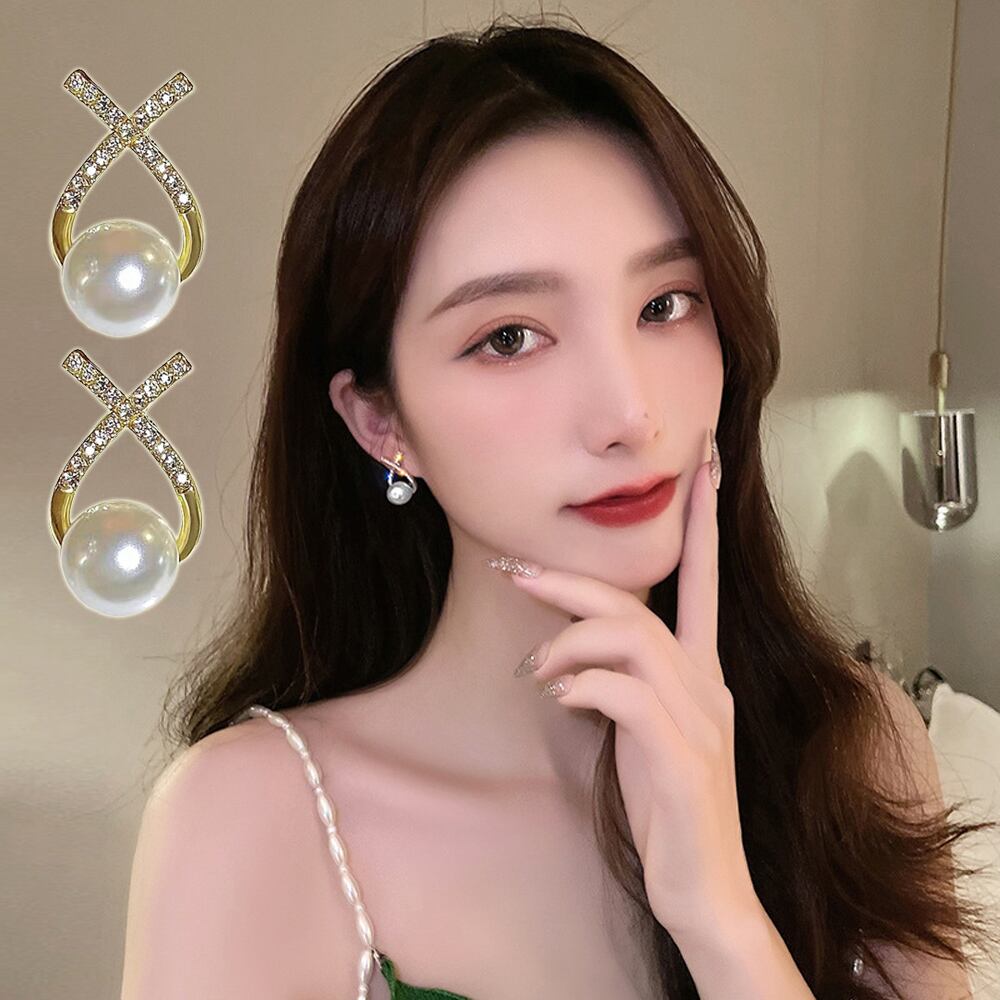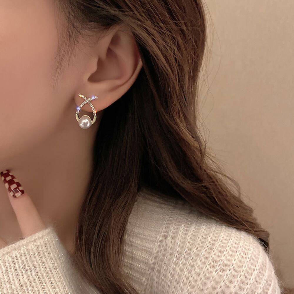 クロスデザインのメタルモチーフときらきら輝くラインストーンに一粒パールのスタッドピアス