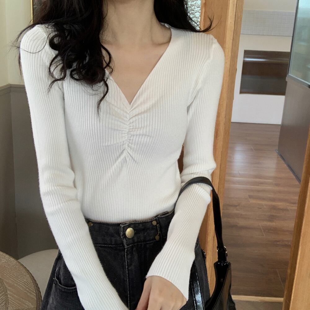 キャザー リブニット トップス レディース Vネック ニットカットソー 着やせ