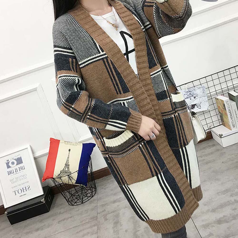 ニットカーディガン レディース チェック コーディガン 羽織り ロングカーディガン