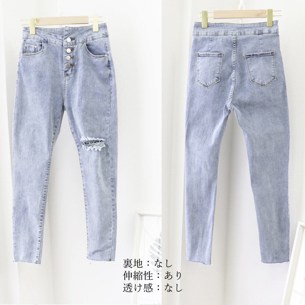 韓国風 ロングパンツ ダメージ加工 春秋 ハイウエスト フィット感 シルエット シンプル オシャレ