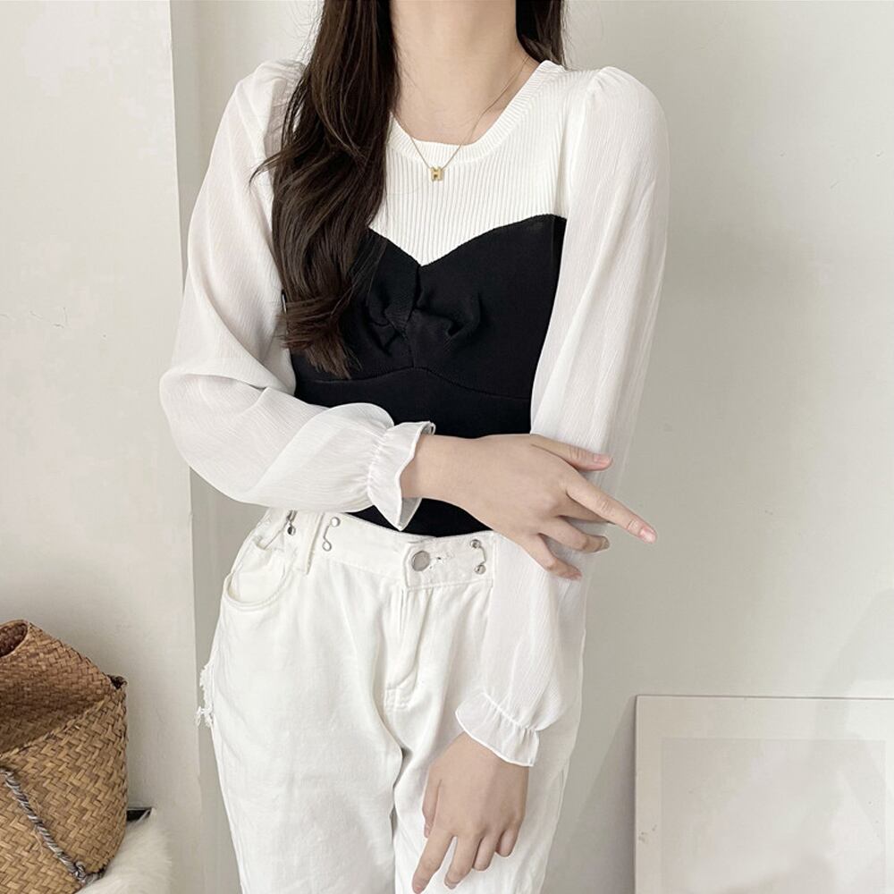 ショット丈トップス 袖シフォン ラウンドネック 切り替え ブラウス 異素材 長袖