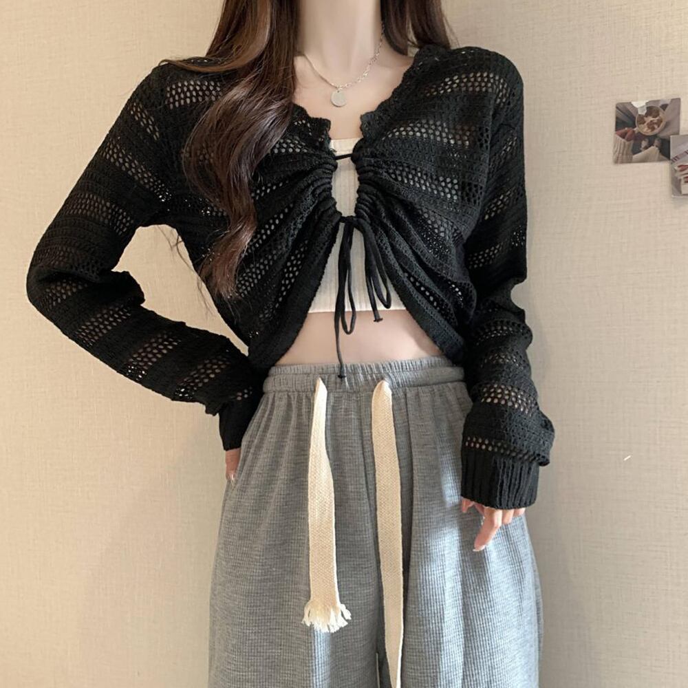 透け感秋服かぎ編み 韓国風 ショート丈 メッシュニット春秋
